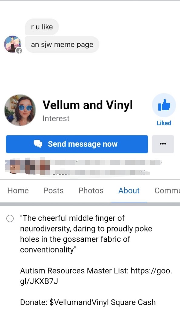 In 2016 or 2017 I reconnected with an old friend from CEGEP on Facebook. This friend regularly shared content about neurodiversity, autism and ADHD because they had just been diagnosed autistic themselves. As I had been diagnosed with ADHD in 2013 and already had an interest in neurodiversity since my first diagnosis, I read a lot of those posts and found them interesting. Then I started following the same neurodiversity and autism pages that those posts were shared from (most notably one page called Vellum and Vinyl).
